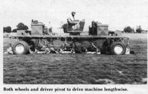The new-style tractor is 10 ft. long, 30 ft. wide and resembles a selfpropelled toolbar powered by twin engines, one at either end. Each of the four tractor-sized wheels, also mounted at the ends, is hydraulically driven. Conventional tillage tools, planters and other equipment can be used, and are suspended beneath the frame, which clears the ground by 5 ft. and can be adjusted to other heights. Wheels turn at right angles to the frame, allowing the machine to travel down the road and through gates.