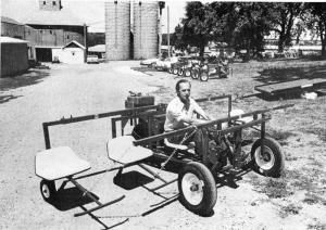 Grau "Bean Buggies" are powered by an 8 hp Briggs and Stratton engine. They feature Peerless transmissions with five forward speeds, a neutral and reverse. Speed ranges from 0 to 10 mph. Steering is done by the feet, leaving the hands free to wield a corn knife or hoe right from the driver's seat. Front axle adjusts to any row width from 30 to 40 in.