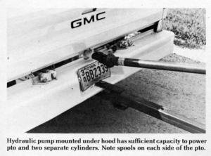 Heart of the system is a specially designed hydraulic pump. It's mounted under the hood and is "free wheeling" when not in use to save gas. It provides high capacity power to drive the rear-mounted hydraulic pto which is both "live" and reversible. The pump, rated at 2,250 psi, has sufficient capacity to operate one or two hydraulic cylinders. You can buy the complete system (pto and two spools for operating two cylinders) or any part of the system. For example, you can order a pto only, a pto and a single hydraulic spool, or a double spool (for operating two hydraulic cylinders) and the pto.