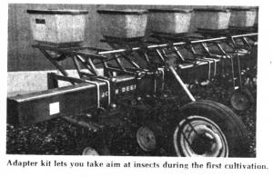 "Most corn growers cultivate at least once. This is a good time to take a second shot at rootworms, corn borers and other corn insects," says Bob Anderson, sales representative for Green Country, Geneva, Neb., manufacturer of a bracket that adapts Deere Max-Emerge planter insecticide boxes to most any type of cultivator. The adapter kit fits 7 by 7, 5 by 7, 4 by 7 and 4 by 4 toolbars. It includes brackets, drive shaft, sprocket and gears. The insecticide boxes are actuated by a ground-driven gauge wheel. "Some farmers are using an auxiliary motor to drive them," notes Anderson. "Insecticide can be applied to the whorl or to the base of the plant."