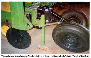 That's when Lou Siebert suggested connecting the hinged V-wheels with a 22-in. dia. coulter that would actually guide the planter. They mounted the coulter on a hinging bracket near one end of the toolbar and ran a tie rod from the coulter to the hinged V-wheels so that when the V-wheels turn, the coulter turns too.
