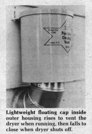 The idea for the vent came to Steinke in his own home. "I used to go into the clothes dryer room to brush my teeth and that blast of cold air aggravated me," he says. He first tried to seal the vent tube with a lightweight styrofoam ball that would blow off the tube when the dryer was on and fall back into place when it was off, but he says it made too much noise. Production models have a floating lightweight cap that lifts off the tube when the dryer's on and locks back down tightly when it's off. The cap is protected by an outer cover that also keeps out mice, bugs and birds.