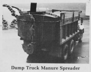 Dump Truck Manure Spreader MANURE HANDLING Equipment 7-4-9 "My truck liquid-manure spreader is more versatile than a tractor drawn tank and I can make better time on long hauls. Also, it'll get up and down much steeper terrain than a tractor and spreader," says Fred Garber, Lancaster, Penn., who put a manure tank on the back of a truck to build a self-propelled manure spreader that easily converts to a dump truck.