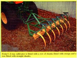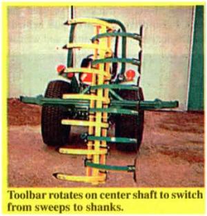 Freier's 2-way cultivator is fitted with a row of shanks fitted with sweeps and a row fitted with straight shanks. To switch from one to the other, he simply pulls pins, slides the toolbar back, and rotates it on a center shaft. Other implements could be adapted to the system.