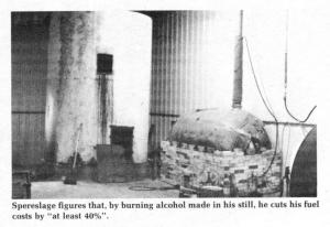Spereslage makes alcohol in his still for about 40 cents a gallon. Figuring diesel fuel at $1.00 a gal., he figures he cut his fuel costs on his diesel by 40% or more. "And I get 4 extra horsepower," he says.