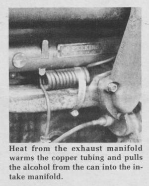 The alcohol converter in his Ford F-150 6 cyl. pickup consists of a Lasso chemical can mounted horizontally near the front of the engine compartment under the hood. An air pipe runs from outside the top of the can to near the bottom of the can. A small tube runs out the top of the can, through a simple turn-on valve and to the air intake valve below the carburetor. When the turn-on valve ù operated from the driver's seat ù is open, air is pulled through the small tube from the can where it has been pulled down through the alcohol and back up again, picking up alcohol vapors. As soon as the valve is opened, and the alcohol vapors start entering the engine, Spereslage says the engine quickly increases its speed by 700 rpm's.