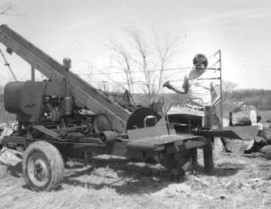 We used the frame, wheels and axles, twin-cylinder engine, and elevator off an old Deere pull-type combine to make a 26-ton capacity wood splitter. It uses an 18-in. high splitting wedge that we made from an old grader blade. The front edge starts out like a splitting axe but 3 in. back it tapers into a splitting maul that can go through even the toughest wood. The wedge is moved back and forth by a 6-in. dia., 42-in. long hydraulic cylinder salvaged from an amusement park ride. The cylinder is powered by a hydraulic pump (salvaged from an old tandem gravel truck) that's belt-driven off the engine. The pump is operated by a double bank of flow control valves. One valve operates the splitting cylinder and the other operates the swing arm on a boom truck equipped with log tongs. We use the boom truck to pick up logs and set them onto the beam for splitting. We use a circular saw mounted on the rig to cut small wood. (Howard Mattson, 2137 295th Ave., Luck, Wis. 54853 ph 715 648-5337)