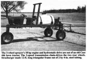 The heart of Strasburger's sprayer is the 18 hp engine and hydrostatic drive out of an old Case 446 lawn tractor he bought from a neighbor. The 2-speed transmission chain-drives the two rear wheels.