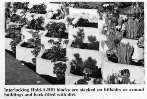 "Hold-A-Hill blocks are interlocking "V''-shaped blocks that are stacked along hillsides or around buildings and then back-filled with dirt. The blocks are made of precast concrete that won't decay or become infested with insects that could invade your home," says M.C. Frehner, company president.