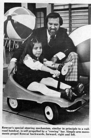 The Rowcar is the brainchild of Australian inventor, Burton Terry, who undertook the effort as part of a Rotarian project in Nunawading, Australia. Originally conceived to give mobility to children from 4 to 10 years with spinal bifida, it works equally well for those with cerebral palsy, polio and other handicaps affecting the use of the spine and lower extremities. Ultimately, larger models of the Rowcar will be developed for use by adults, according to the manufacturer.