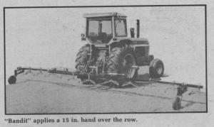 The Bandit applies chemicals in a 15 in. band, 7 1/2 in. on each side of the plant row, so the area directly next to the crop is sprayed, but leaves the area between the bands unsprayed.