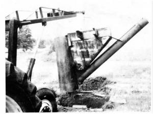 He purchased an old 50-bu. combine grain tank at a salvage yard. He ran two large pieces of channel iron through the upper ends of the tank and attached a 2-ft. dia. piece of heavy pipe to the side of the hopper. The large pipe extends a foot or so below the hopper and is used to house a sump pump, which clears water out of the bottom of the pit.