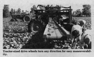 It's unique in that its wheels pivot from row-crop configuration at the push of a lever to travel down the road at 12 mph. Also, the picking platform, which consists of a variable speed conveyor, can be adjusted in height to adapt to a variety of crops.