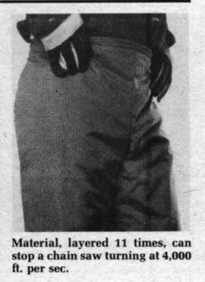 Made of the same type material used to make bullet-proof vests, the pants and chaps can snag and stop a chain saw turning at over 4,000 ft. per sec.
