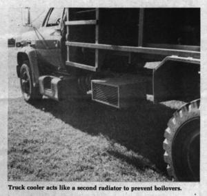He says the cooler has so far been used primarily on grain trucks with automatic transmissions because the transmission cooler is often mounted ahead of the radiator, restricting air flow. But he says it will work on any vehicle with an overheating problem. He recently installed one on a brand new International truck. Sells for $600.