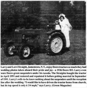 Enjoy Deere Tractors AG WORLD Ag World 17-2-20 Larry and Lorri Straight, Jamestown, N.Y., en joy Deere tractors so much they had wedding photos taken aboard their pride and joy - a 1936 Deere BO. Larry even wore Deere-green suspenders under his tuxedo. The Straights bought the tractor in April 1991 and restored and repainted it before getting married in September of 1991. Larry's wife-to-be knew nothing about the suspenders until the reception line after the wedding. "I would like to have driven the tractor home from church, but its top speed is only 6 3/4 mph," says Larry. (Green Magazine)