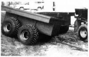 I built a deluxe AN trailer with flotation tires and walking beam axle for my own use 6 years ago. Other people saw it and wanted one so I started building them for sale. They ride smoothly over rough ground or when pulled through the woods. The trailer is the width of a 4-wheeler - 43 in. - and is 6 ft. long. It's fitted with 25-in. wheels 4 on the tandem walking beams. The box is made out of wood with a steel undercarriage. It has a deep well down the center with shallow sides over the wheels.