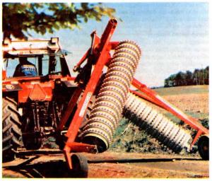 A single-acting hydraulic cylinder (4 by 24 in.) controls the fold-up action "on the go" right from the tractor seat. Hitching can be to the lower links of a 3 pt., or to a standard drawbar. The rollers, made of 76 rings (18 in. in dia.), have a total weight of 3,100 lbs. which is spread over the full width.