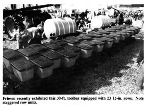 Milford Friesen has been building and selling 60-ft. toolbars on a limited basis ever since FARM SHOW first featured his big planters in 1989 (Vol. 13, No. 6). Now he's started selling his giant planters through Deere dealers, equipped with no-till coulters, starter fertilizer tanks, and programmable Rawson hydraulic population control systems. Front-mount lift wheels leave the area behind the toolbar clear so no skip rows are needed when set up for 15-in. rows.