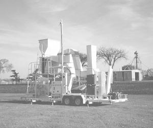 The second machine is a stationary processing unit that can be located back at the grain storage area. It separates grain from the crop material gathered in the field and cleans it to export standards using new air cleaning technology. It uses a roller mill to crush and compress the collected chaff and weed seeds for use as livestock feed, litter, or for disposal. The processing unit, which has been built and is undergoing testing, is powered by a new-style 30 hp. single-phase electric motor.