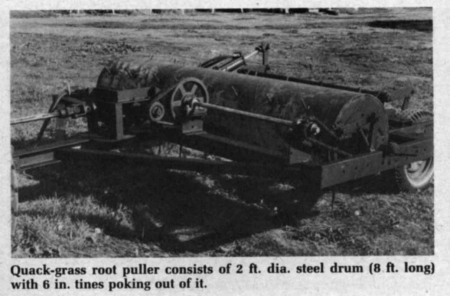 "We're trying to replace Roundup, which costs quite a bit an acre to apply in this part of the country," says Stan Wiskel, Athabasca, Alta., who's invented a new rolling root puller machine that provides up to 90 percent control of quack grass by yanking it out by the roots and leaving it on the surface to dry out and die.