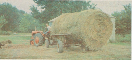 Three bales are placed end-to-end on the rails for transport back to the farm. To unload he simply tips up the rails with the cylinders and they roll right off.