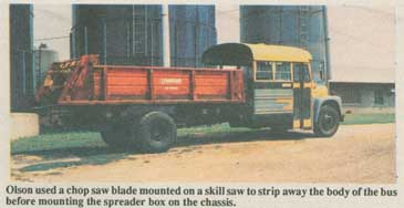Olson bought a 1973 International schoolbus equipped with a V-8 gas engine. He stripped away most of the body and mounted a 17-ft. long, 6-ft. wide used Farmhand manure spreader on the frame. The spreader is chain-driven by a 6-ft. long pto shaft that runs off the bus's transmission.