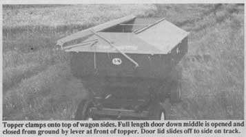 "It's stronger, safer, and faster to use than a canvas topper and will last as long as the wagon," says Koch. "Canvas toppers sag, rip, weathercheck, and get blown around by the wind. They're difficult to put on because you have to climb on top of the wagon where there's nothing to hold onto. You use a front-end loader to set our topper on top of the wagon and fasten it with 10 clamps. The job takes only a half hour and there's no need to drill any holes.