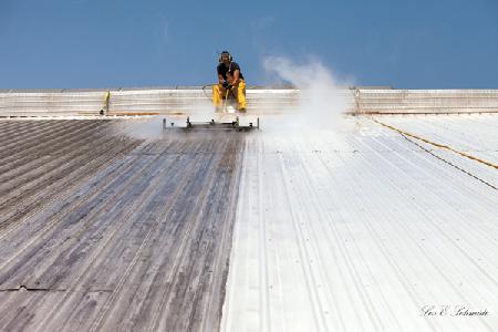 “I can cover 25,000 sq. ft. in a day,” Schmidt says. He typically sets up to wash 200 ft. of roof on each side.
