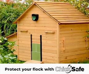 The ChickSafe door from Brinsea lets chickens out in the morning and shuts them in at night. The door opener has no mechanical switches and just one moving part that lifts the door. It relies on gravity to close the door; microprocessors do the rest.