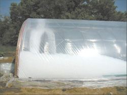 Elliott mounted his foam generators in the ridgeline of the greenhouse with one facing the north side and one the south. An irrigation pump supplies the solution to the foam generators. Filling the north side in the winter during the day allows sunlight to penetrate from the south side while reducing heat loss to the north. At night, both sides are filled with bubbles to reduce heat loss. During the summer the south side can be filled to reflect excess sun and lower interior temperatures.