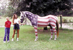 Since September 11, millions of Americans have demonstrated a renewed sense of patriotism by flying the flag. Renee Linzalone decided to go one step further by painting the American flag on Captain, her 21-year-old white Arabian horse. Renee and husband, Mike, live on a small farm near Newberry, Fla. They used clothing dye and shoe polish to paint the stars and stripes on both sides of the horse.