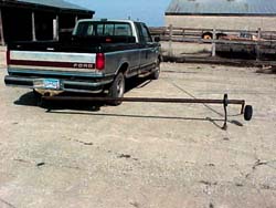 The row marker unit is simplicity at its finest. Wichmann simply cut a length of 1 1/2-in. sq. tubing to run from his pickup hitch to a point just beyond the 13 ft. mark, on about half the width of the planter. Wichmann mounted a single Danish tooth at the end of the marker to form the row mark. A used 6-in. lawn mower wheel mounts at the end of the tubing to become both a depth gauge and a carrier for the Danish tooth. Chain runs from the end of the marker to a hook on the front bumper of the pickup.