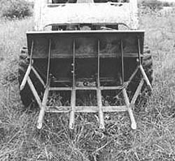 The brush fork is made from 1 1/2-in. dia. steel shafts spaced 8 in. apart. Thin strips of steel plate welded on between the shafts form a cutting edge. The back ends of the shafts are welded to a solid steel plate that serves as a brush guard.
