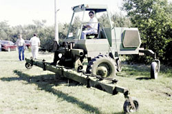 He first bought a used swather table at a wrecking yard and cut off everything except a steel beam that attaches to the front of his swather power unit. Then Woolhouse mounted nine rotating horizontal steel rods (made from cold-rolled steel) under the beam and hung a 6-in. length of fine chain from the end of each strap. Each "blade" is fitted with a pulley that's belt-driven off the swather driveshaft.