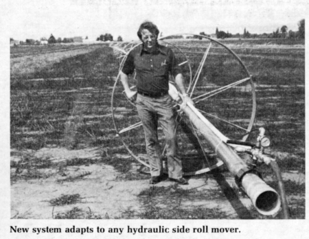 The power source is a small single stage air compressor that can be located at the well site, mounted on a trailer, or carried in a pickup truck. The system mounts quickly and easily and is adaptable to any hydraulic side roll mover, L. R. Townsend, vice president, told FARM SHOW. Forward and reverse movement is easily controlled by a valve mounted at the end of the pipeline.