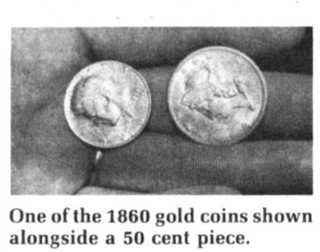 The coins were dated from 1850 to 1860, leading nearly everyone in Albion to conclude that the money had been buried there by a miner called "Applegate" who had "struck it rich" in the California Gold Rush of 1849, and later settled on what is now the Collins place. Applegate had told townspeople when his house burned that he wasn't worried about losing his money because it "was buried".