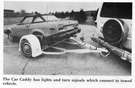 Now, thanks to the new "Car Caddy" from Fleming Mfg., Hastings, Neb., you can take a smaller car -- with front or rear wheel drive, and with manual or automatic transmission -- along behind your motor home when you travel, or behind your tractor or other farm vehicles to provide transportation to and from headquarters.