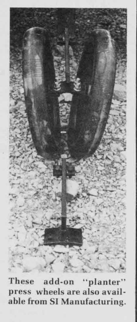SI Manufacturing, in Spencerville, Ohio, has also come up with a modification kit for press wheels on Deere drills that converts the single, vertical wheel to a V-shaped, 2-wheeled assembly. A special bracket mounts in place of the single-wheeled bracket and the old press wheel, along with a new one purchased from Deere, is mounted on it in the same V-shaped configuration used on Max Emerge planters.