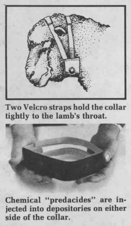 The coyote killing collar is sold now throughout the world, primarily in Mexico, Canada and South Africa (for jackals). It's made out of black rubber that has two soft depositories in it for the injection of poison. Two Velcro straps fasten them to sheep necks.