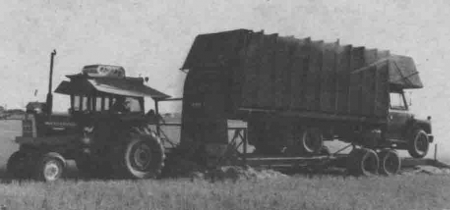 We have to travel up to 16 miles to haul chaff in from our farthest fields," says Peter Leismeister, Consul, Sask., who, along with his brother Tony, devised a way to blow grain chaff into a 3-ton International truck which rides piggyback behind a converted Hesston Stakhand.