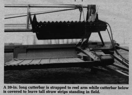 It fits on most pull-type swathers and is "on the drawing board" to be adapted to self-propelled swathers and combines. The 39-in. long cutterbar with sickle sections mounts on the stationary center reel arm and is positioned just under the reel. When cutting grain, the Stripper cuts the crop ahead of and higher than the swather cutterbar, leaving the taller stubble strips. A shield fits over the swather cutterbar below the Stripper so the longer stubble isn't cut by the swather.